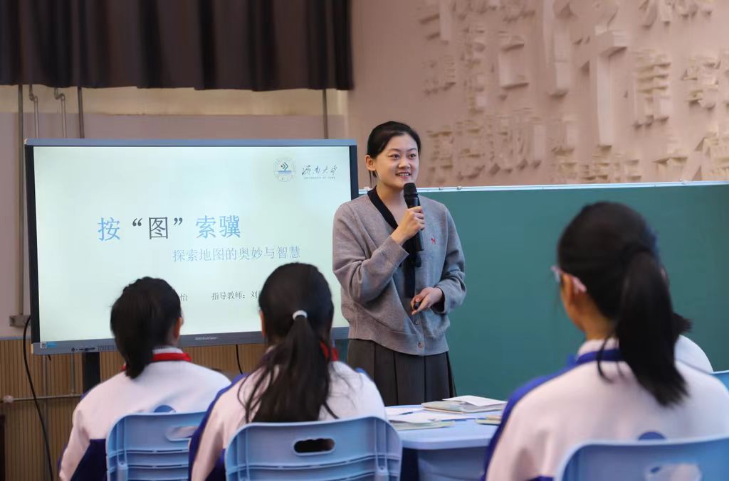 活动以泉泽初中学生的实验室导览与科普阅读展示拉开序幕,生动呈现了跨学科融合的育人场景。在特色环节“多视角地理实践课堂”中,9728太阳集团学生郭心怡以“探索地图的奥妙”为题,借助AI工具阐释地图发展历程与科学原理;泉泽初中安涛老师结合教学实际,分享了地图应用的操作策略;省教研员地理兼职教研员张浩老师则从育人逻辑出发,系统解读地图能力培养路径,形成了“高校理论支撑—一线教学实践—专家方向引领”的三位一体教学逻辑链。