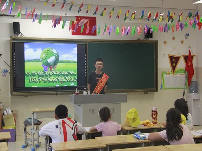 下午三点四十分,志愿者们准时在新西门集合,乘车去往卧龙小学,老师们和同学们对志愿者的到来表达热烈欢迎。课堂伊始,志愿者向同学们简单介绍了世界环境日,“世界环境日为每年6月5日,它的确立反映了世界各国人民对环境问题的认识和态度,表达了人类对美好环境的向往和追求”。PPT上美丽的图片,志愿者绘声绘色的解说迅速吸引了同学们的兴趣,营造出浓厚的学习氛围。在接下来的讲解中,志愿者与同学们积极互动,共同探讨现存的环境问题及在生活中如何保护环境,低碳生活,孩子们跃跃欲试,纷纷表达自己的想法观点,废物利用、节能减排,少开私家车等等,表示要将知识落实到生活中,保护地球从身边的点点滴滴做起。