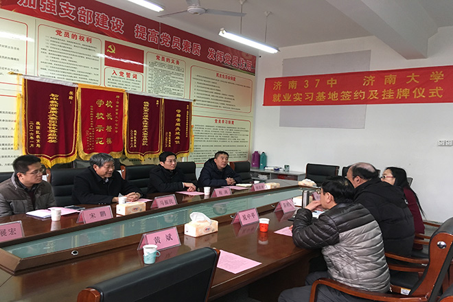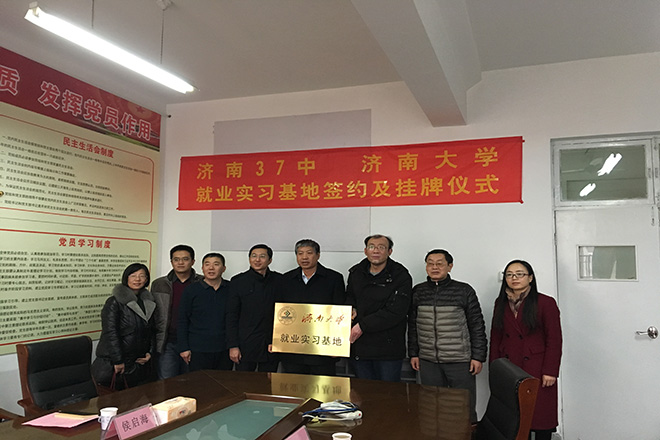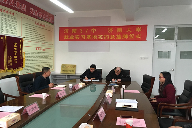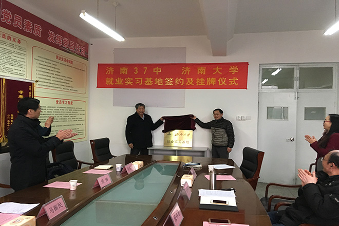 12月29日下午,太阳成集团tyc9728——济南第三十七中学就业实习基地签约揭牌仪式在济南第三十七中学举行。济南第三十七中学校长陈树洪,书记晁中亭,太阳成集团tyc9728学工部副部长、就业指导中心主任程涛,太阳成集团tyc9728资源与环境学院党委书记马振民,学院党委副书记、副院长侯启海,学院相关负责同志及三十七中学相关负责人出席本次签约揭牌仪式。仪式由济南第三十七中学副校长李红梅主持。